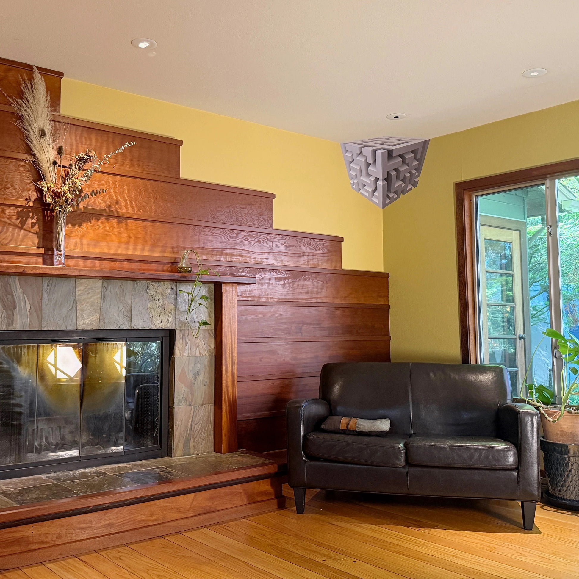 Die Illusion ist trügerisch einfach – und selbst wenn man weiß, wie sie funktioniert, kann sie immer noch unglaublich wirken. Drei abnehmbare Paneele (verschiebbar, farbanstreichbar) werden genau entlang der Wände platziert, die sich in der oberen Ecke eines Raumes treffen. Jeder Aufkleber ist mit sorgfältig berechneten visuellen Hinweisen gestaltet, die die Illusion eines invertierten Raums verstärken – wodurch die Ecke hervorzustechen scheint, anstatt sich zurückzuziehen, was Ihr Gefühl für Tiefe und Realität auf den Kopf stellt.
